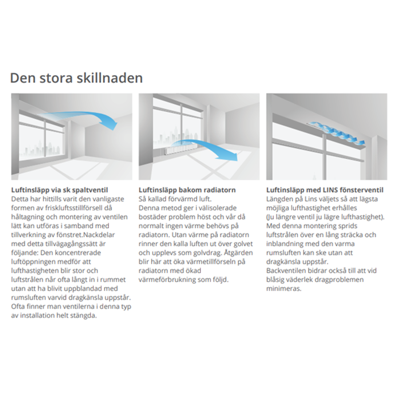 Genom att reglera luftflödet termostatstyrt och sprida luften över en längre sträcka, minskar Fönsterventil Lins risken för kallras och drag – ett vanligt problem med traditionella spaltventiler.